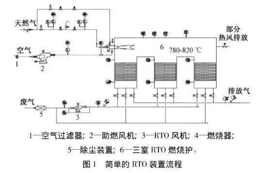2)RTO的燃烧方式与TO相同,只是将换热器改为蓄热陶瓷,高温燃烧气与新进废气交替进入蓄热陶瓷直接换热,热量利用率可提高到90%以上,理念先进,运行成本较低,是目前国家主推的废气治理工艺。
