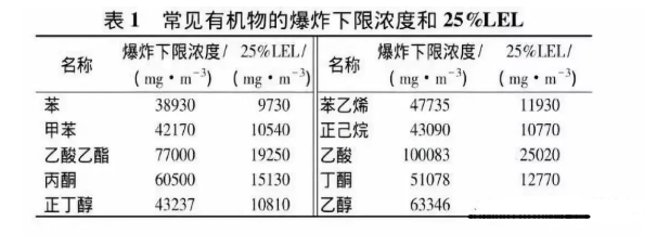 由于温度的提高会降低有机物爆炸下限浓度,通常要控制废气进口浓度<25%LEL,常见有机物的爆炸下限和25%LEL如表1。