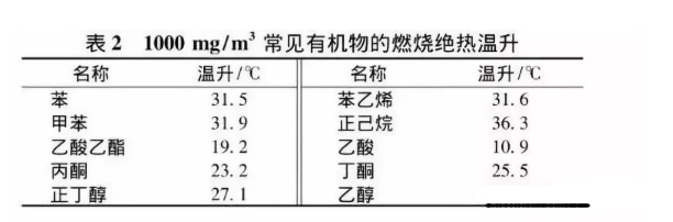 有机物氧化分解会放出大量热量使得废气温升,计算1000mg/m3的常见废气有机物绝热温升如表2。