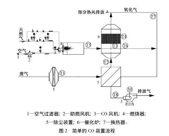 废气如果进口浓度过高,可进风稀析,稀析阀与氧化气温度连锁;废气进口浓度如果为2130~3130mg/m3,可用电或燃气提升废气进催化剂层的温度达到催化起燃温度250℃;废气进口浓度如果<2130mg/m3,可吸附浓缩后再用CO处理脱附出的浓缩气;如果废气初始温度较高,比如很多烘箱废气有80℃,此时CO能处理的废气浓度可以相应降低到1560mg/m3。