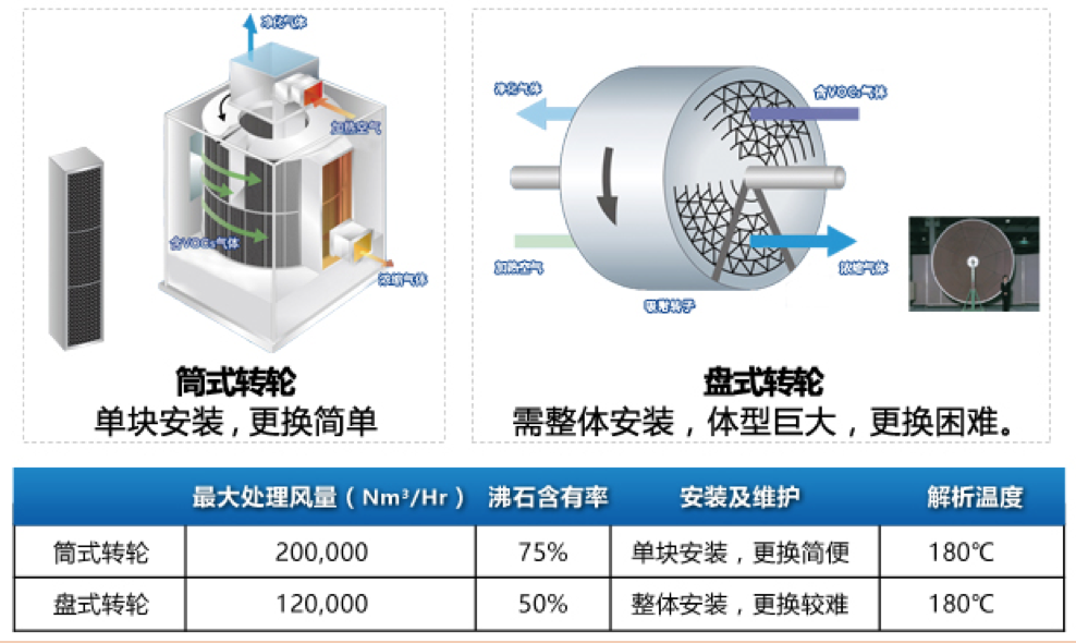 根据处理风量、VOCs成分的不同,可以选择筒式转轮或者盘式转轮进行处理。