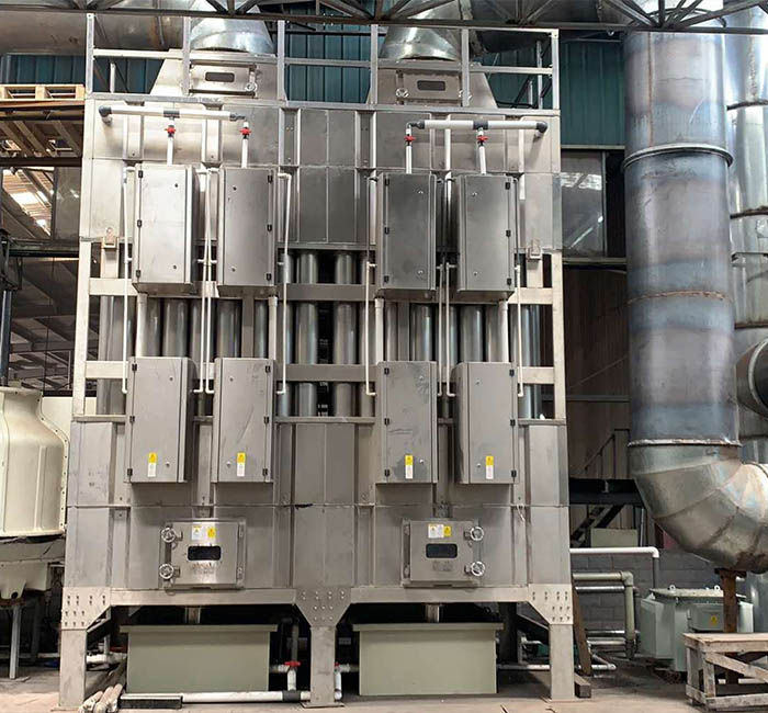 在沥青烟、盐酸、硝酸雾、油雾、压延废气和有机废气通过高压DC电源形成的非均匀电场中,有机废气被臭氧氧化成无害的小分子物质;废气中的粉尘、电池材料行业的沥青烟、盐酸、硝酸雾、油雾、压延废气等与负离子碰撞带负电,飞向集尘电极。电晕电极上只有少量灰尘沉积,定期喷水清洗。两级吸附的粉尘落入集尘斗,通过卸灰装置排至输送机械;木炭行业的沥青烟废物自行下降。